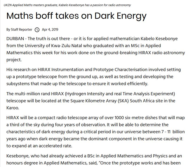 I am very passionate about education and inspiring the young generation through Maths and Physics tutorials as well as outreach programs. I spend my Saturday mornings volunteering at Marrianridge High School, where I tutor grade 8 and grade 12 Mathematics. I also have a passion to develop simple to use tools that provide a good guide to everyday necessities. Just to mention a few: A python Jupyter Notebook that gives people a 'first-look' to Data Science and analysis of South Africa COVID-19 data. This was something I designed as a campaign to keep people engaged during the early days lockdown. I have also designed a simple web calculator that computes estimated costs of South African import duties on different product categories.